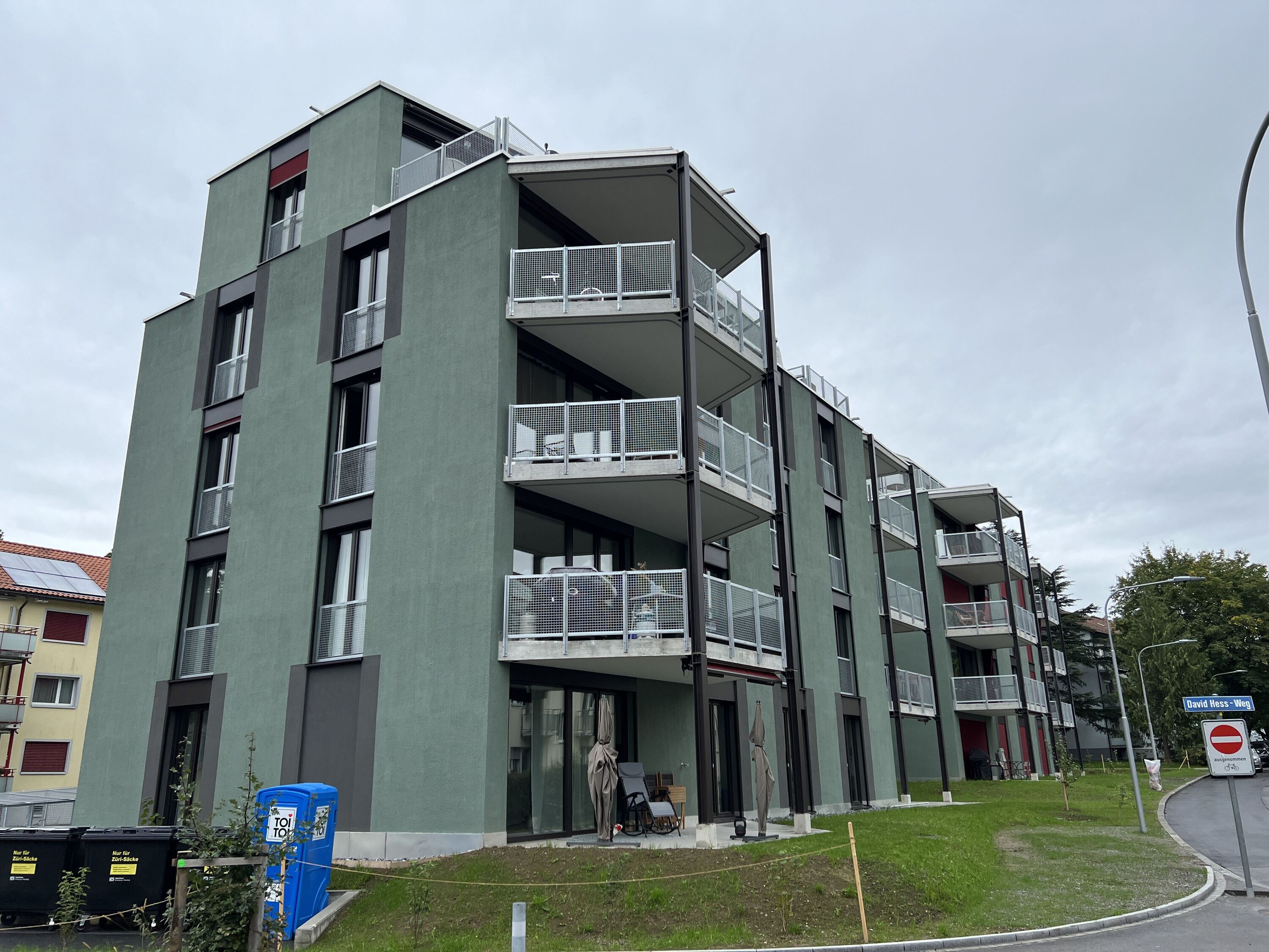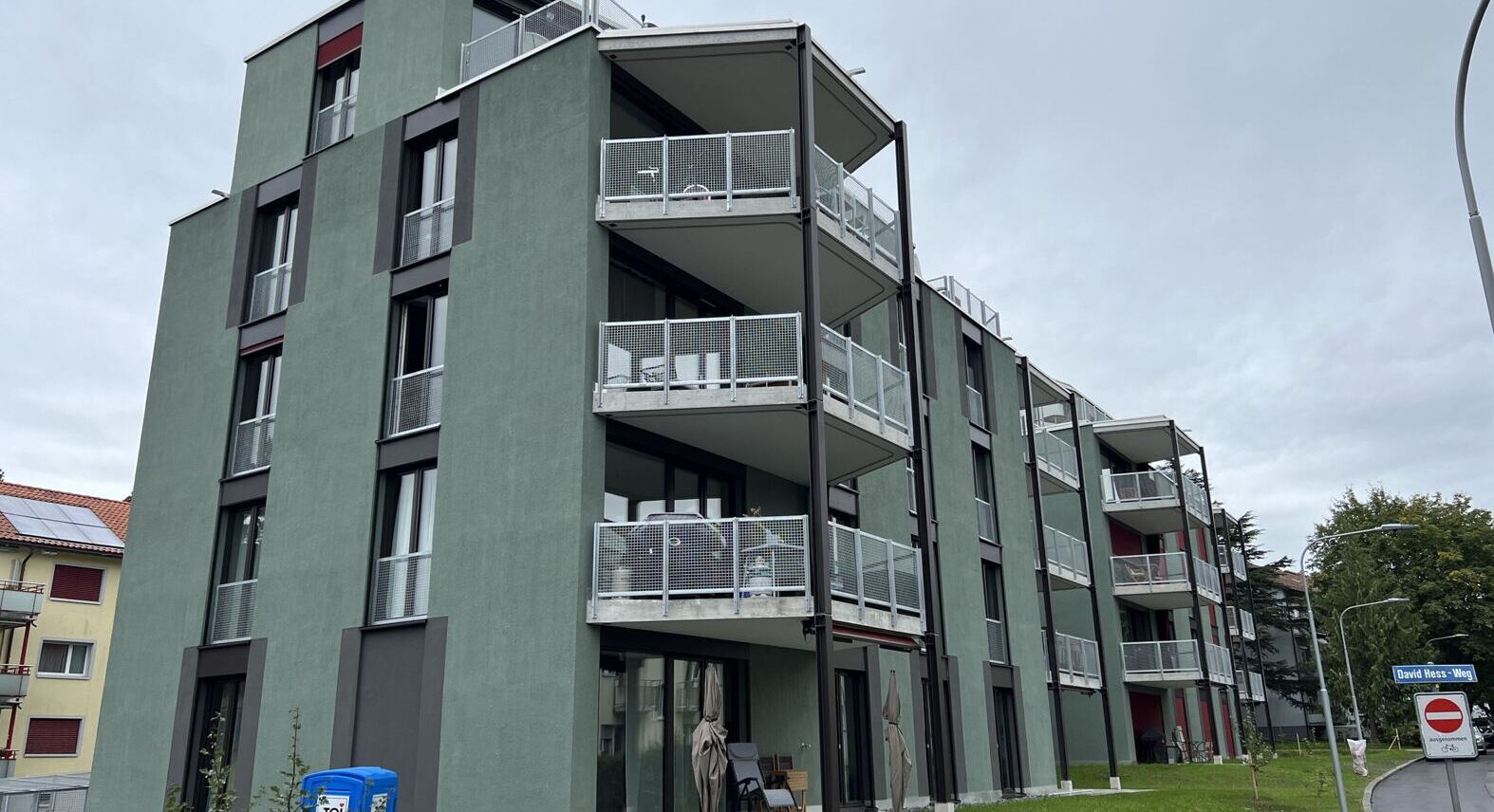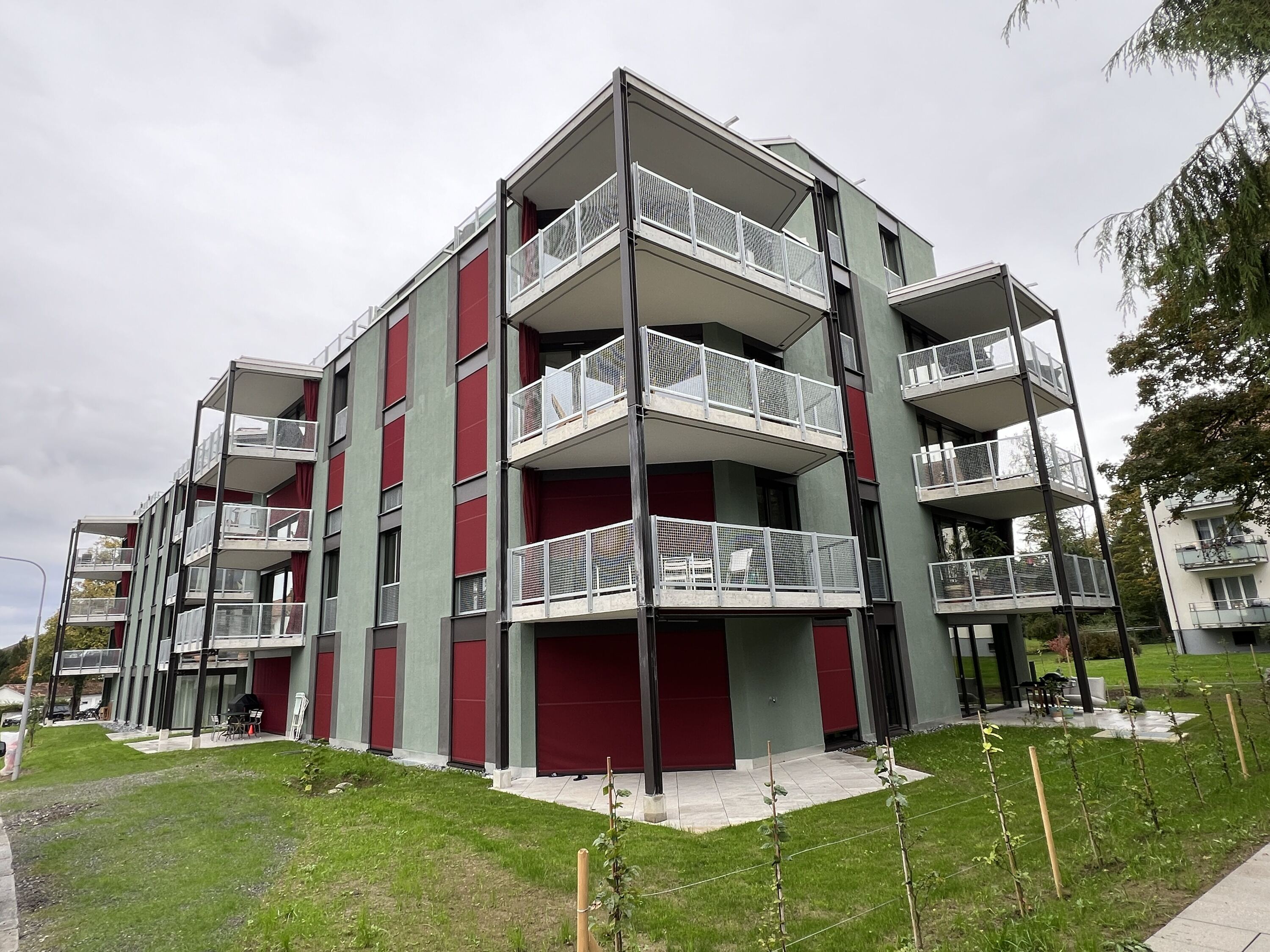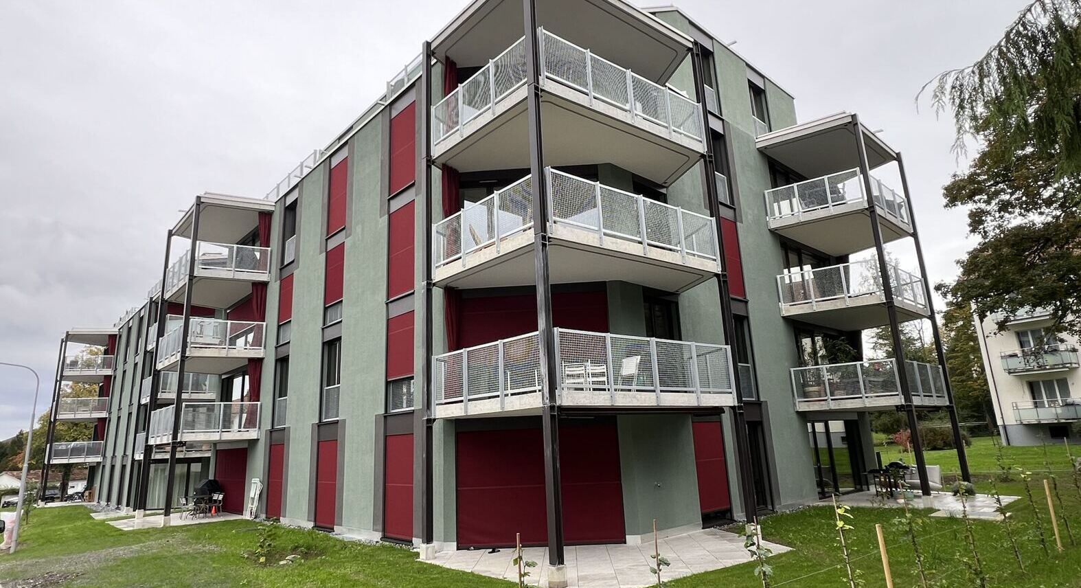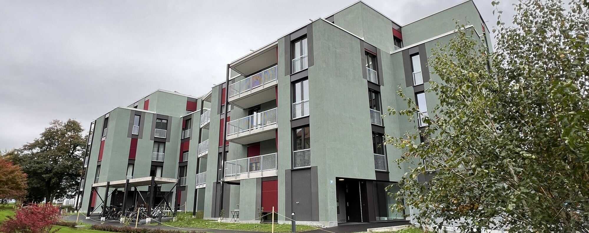 Die neuen Wohnungen profitieren von den attraktiven, begrünten Aussenräumen und der ruhigen Wohnlage. Die beiden Gebäude nehmen mit ihren auskragenden Balkonen die Aussenraumbezüge und -qualitäten auf und fügen sich als architektonisch und formal bewusst gewählte, zeitgemässe Ergänzung in die Umgebung ein. Vor- und zurückspringende Fassadenelemente brechen die grossen Volumina der Neubauten optisch auf. Die Betonung der Vertikalen durch Balkone und Fenster verleiht den Gebäuden zusätzlich eine feingliedrige Struktur. Insgesamt entstehen über 30 unterschiedliche Geschosswohnungen, die sowohl für kleine Haushalte als auch für Wohngemeinschaften und Familien geeignet sind.