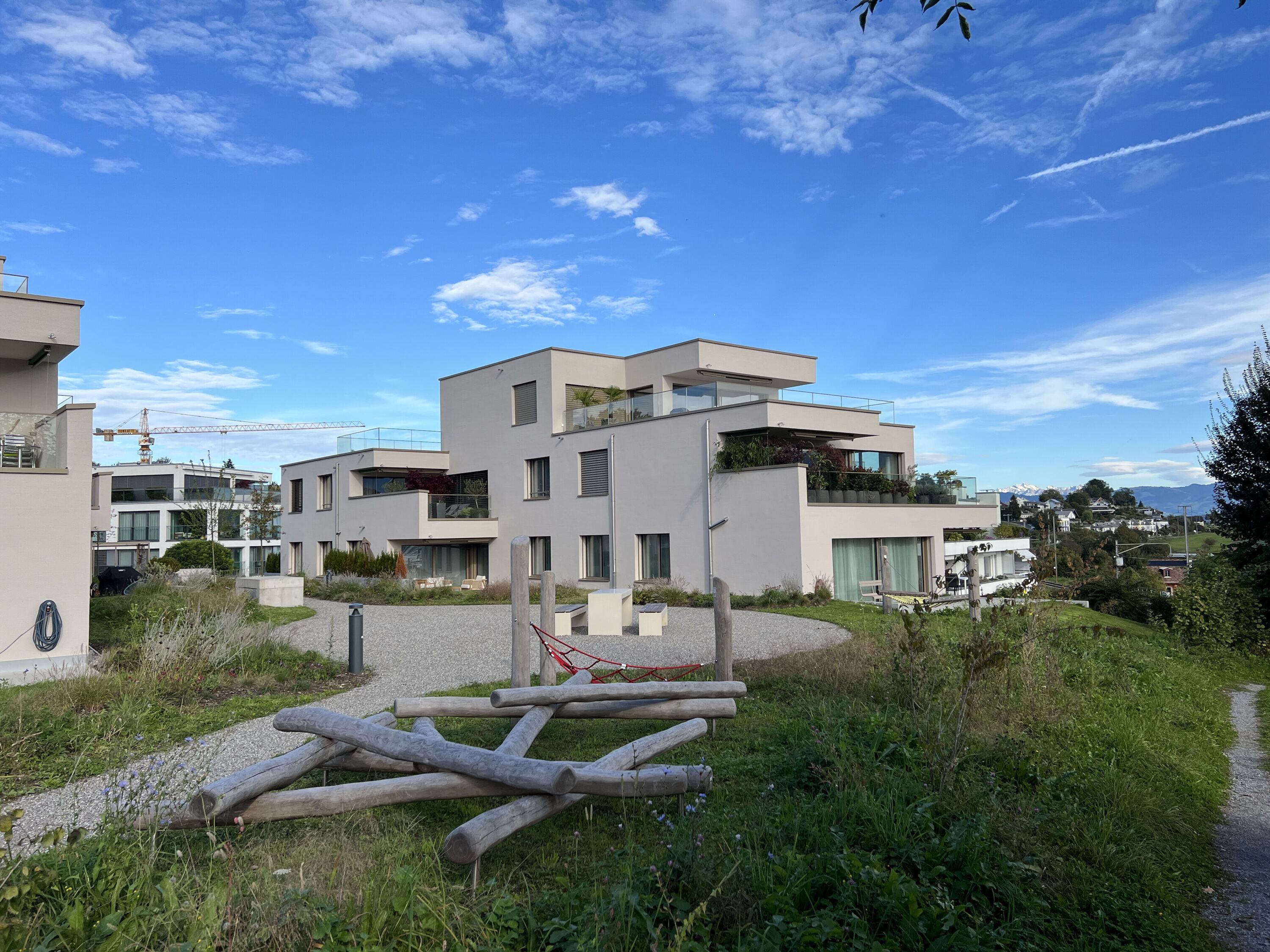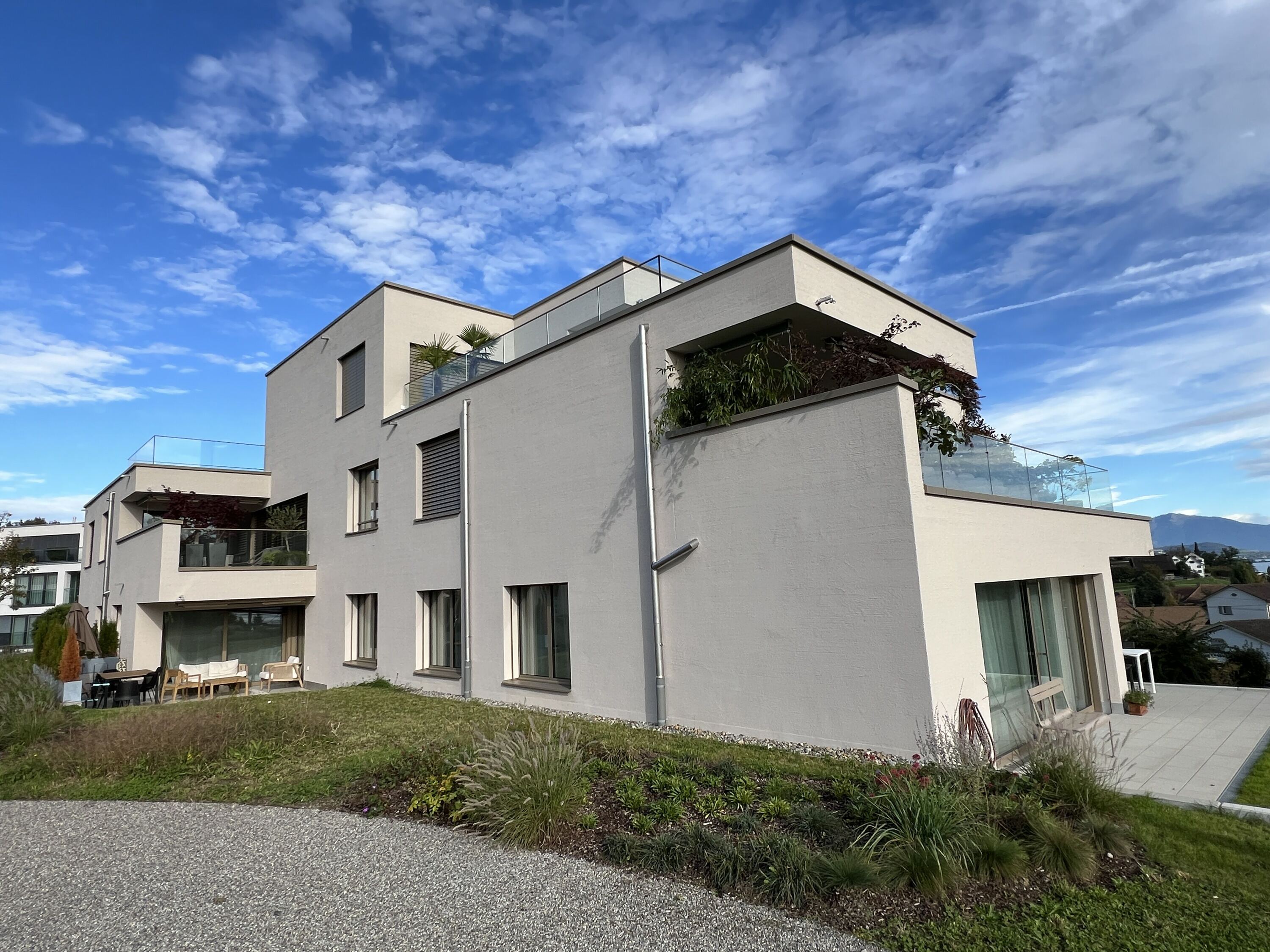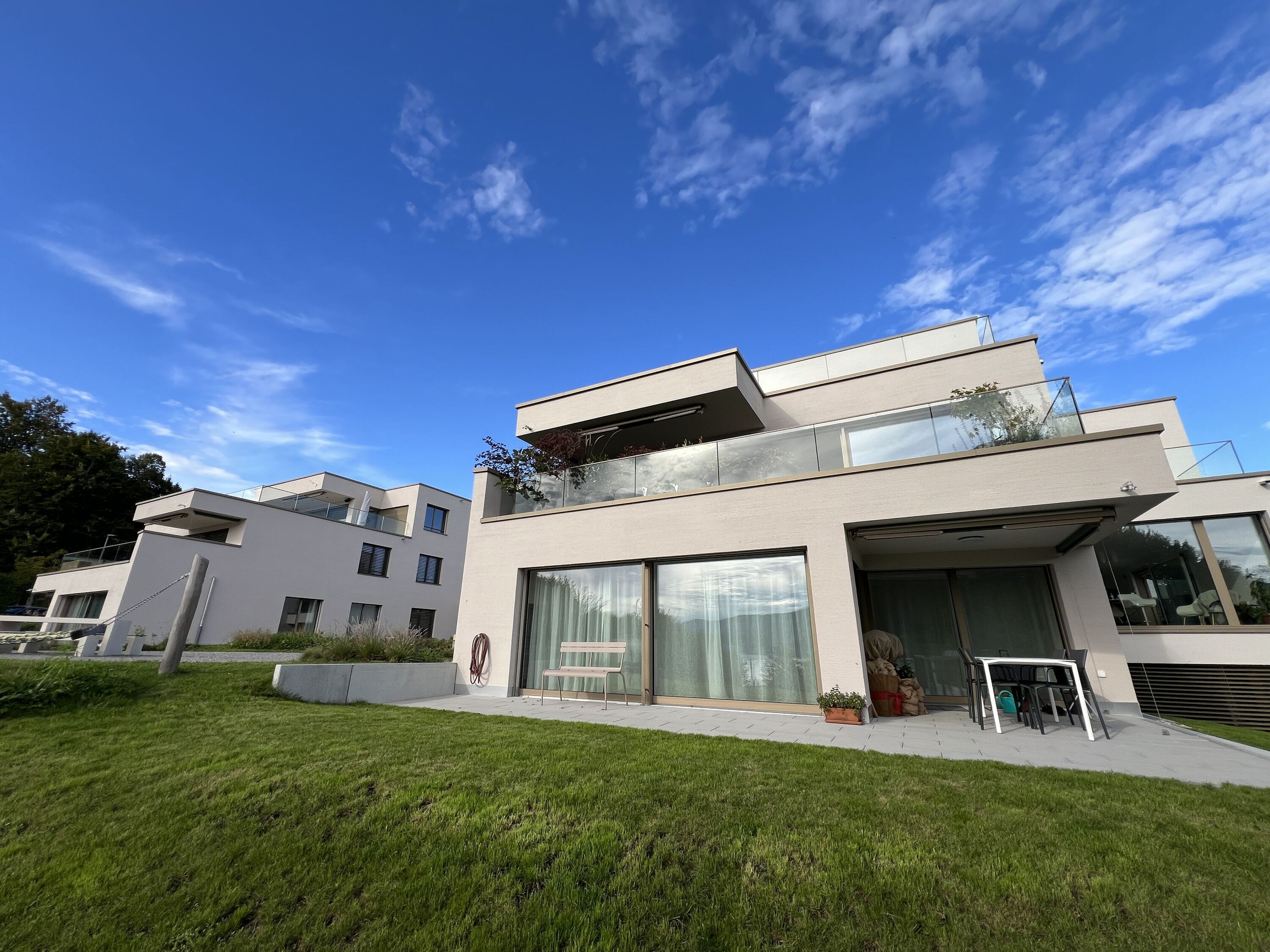 In Uerikon wurde das bestehende Gebäude durch einen Neubau ersetzt. Dieser besteht aus zwei Mehrfamilienhäuser, welche jeweils vier Geschosse aufweisen. Im Untergeschoss sind neben der Einstellhalle die Kellerräume und Technikräume untergebracht. Im Erdgeschoss, Obergeschoss und Attikageschoss finden Wohnungen ihren Platz. Das Projekt fügt sich in die Landschaft ein, indem auf die Hanglage mit einem Splitlevelbau reagiert. Um einen enormen Mehrwert zu schaffen sind die Wohnungen Richtung Süden zum Zürichsee hin ausgerichtet. Weite Fensterfronten und grosse Terrassen laden zum Umherblicken und Verweilen ein. Dazu musste die Fassade mehrere Rückversprünge machen. Die Planung erfolgte mittels der BIM to field Methode. Akribisch wurden die Modelle entwickelt und koordiniert. Dank dieser Planungsmethode wurden die Schalungs- und Bewehrungspläne sehr schnell aus dem 3D-Modell abgeleitet und erstellt.