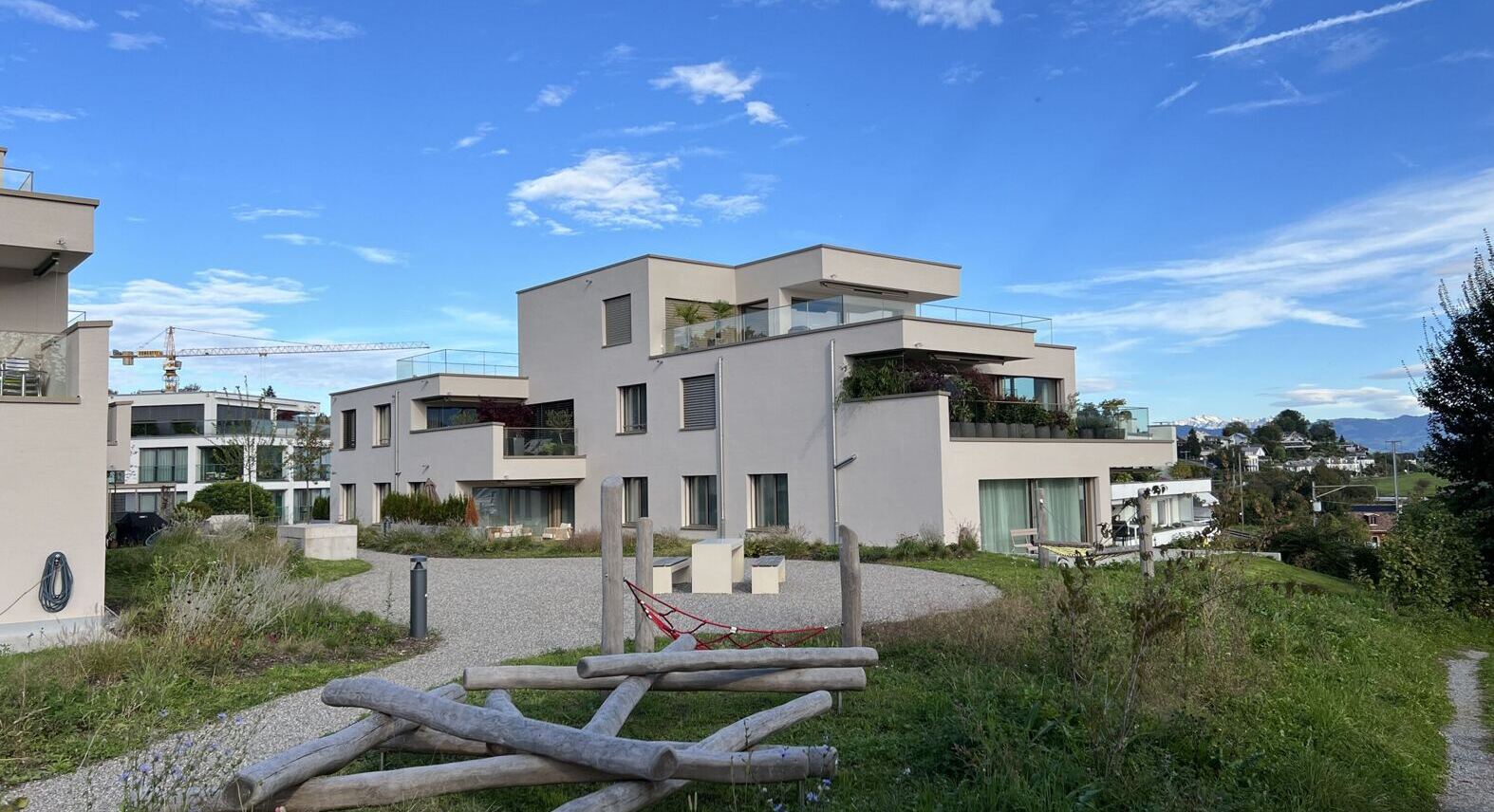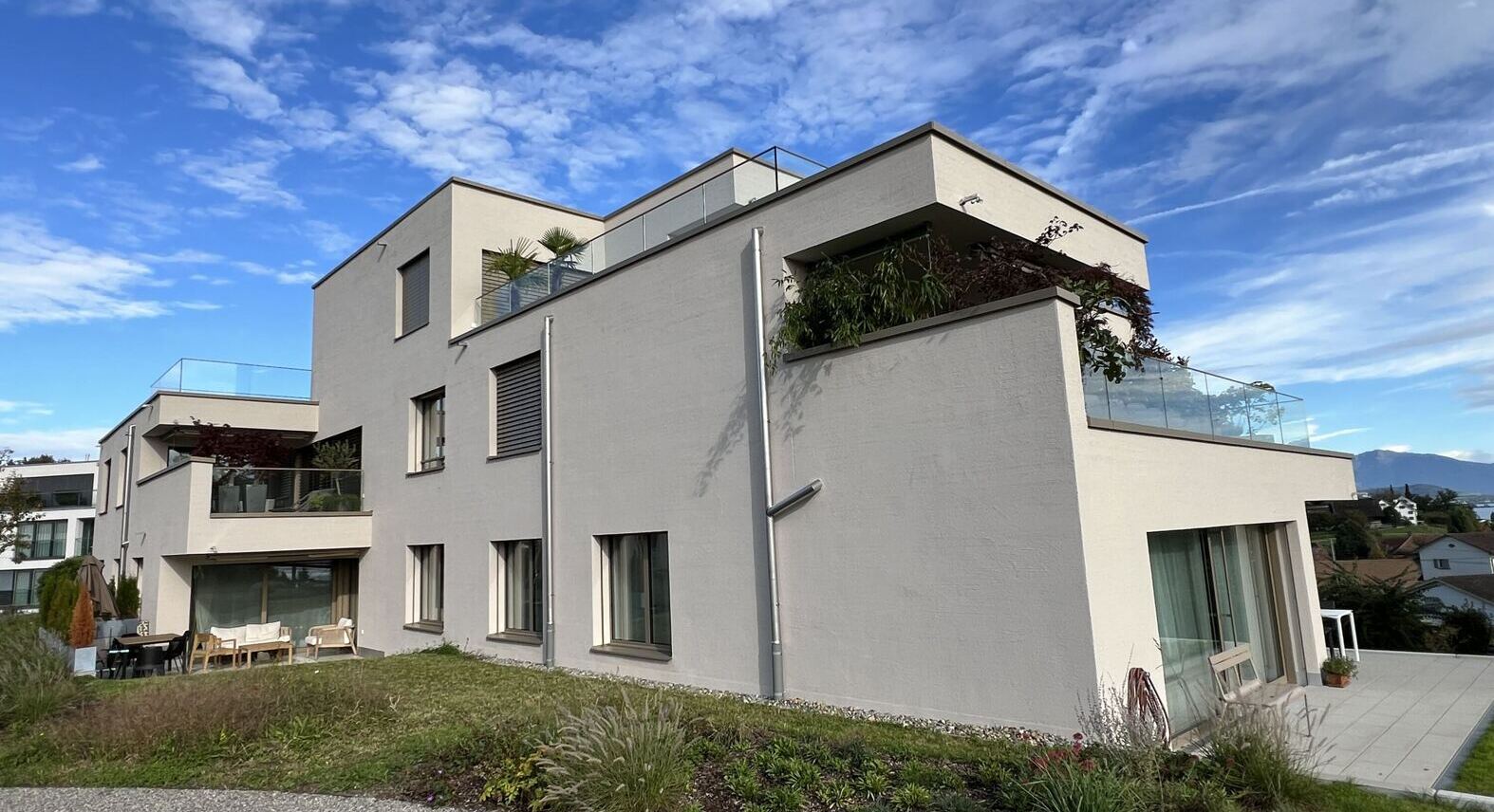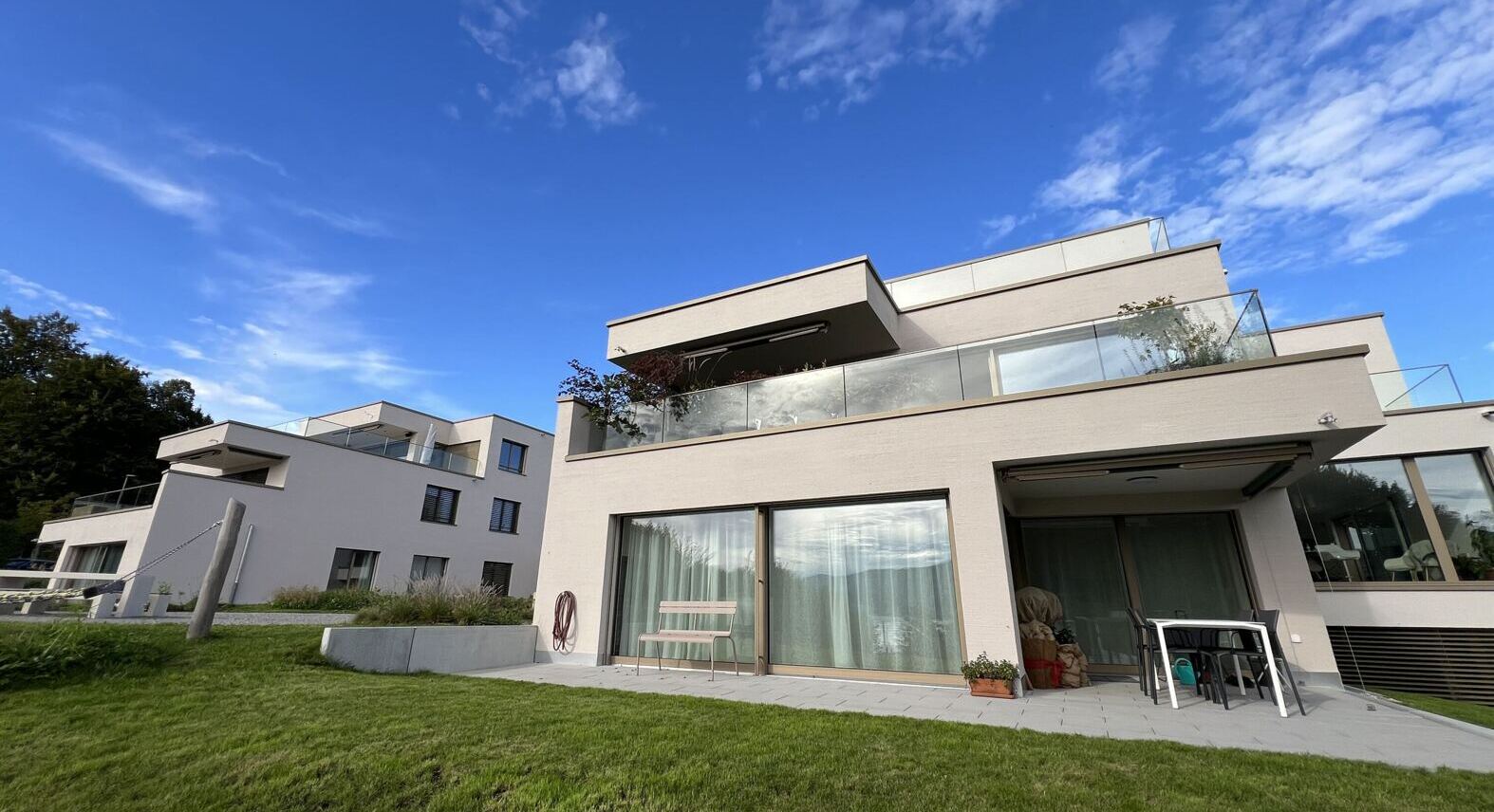 In Uerikon wurde das bestehende Gebäude durch einen Neubau ersetzt. Dieser besteht aus zwei Mehrfamilienhäuser, welche jeweils vier Geschosse aufweisen. Im Untergeschoss sind neben der Einstellhalle die Kellerräume und Technikräume untergebracht. Im Erdgeschoss, Obergeschoss und Attikageschoss finden Wohnungen ihren Platz. Das Projekt fügt sich in die Landschaft ein, indem auf die Hanglage mit einem Splitlevelbau reagiert. Um einen enormen Mehrwert zu schaffen sind die Wohnungen Richtung Süden zum Zürichsee hin ausgerichtet. Weite Fensterfronten und grosse Terrassen laden zum Umherblicken und Verweilen ein. Dazu musste die Fassade mehrere Rückversprünge machen. Die Planung erfolgte mittels der BIM to field Methode. Akribisch wurden die Modelle entwickelt und koordiniert. Dank dieser Planungsmethode wurden die Schalungs- und Bewehrungspläne sehr schnell aus dem 3D-Modell abgeleitet und erstellt.