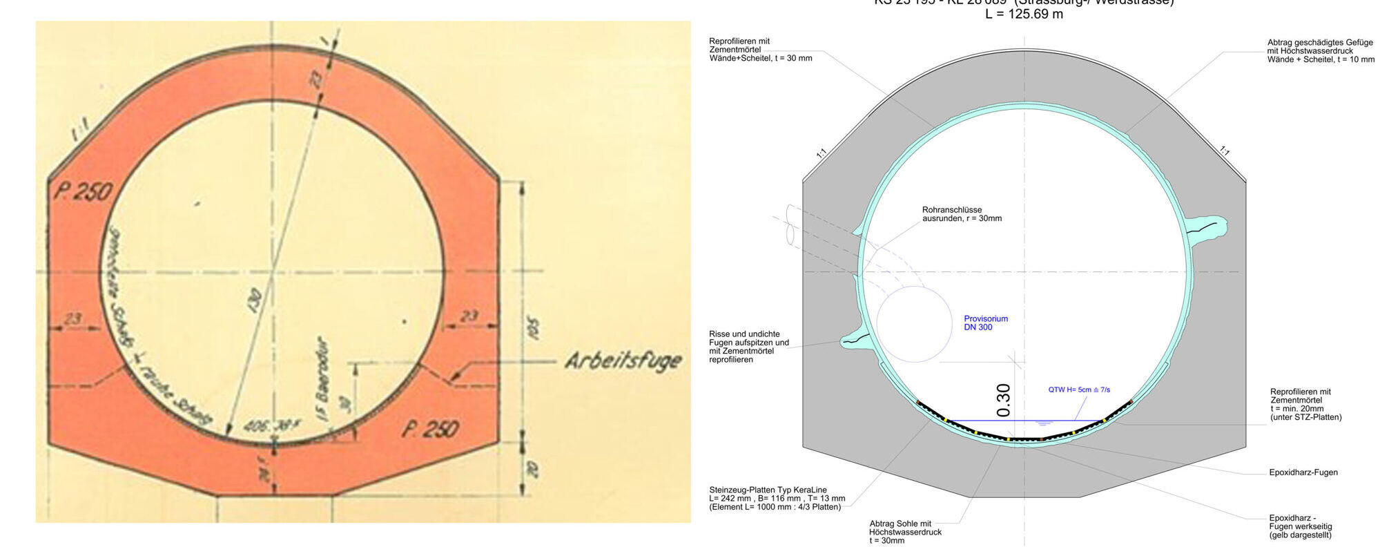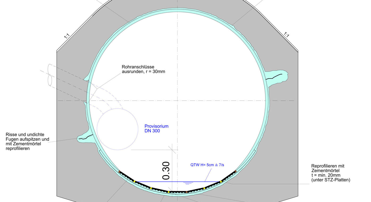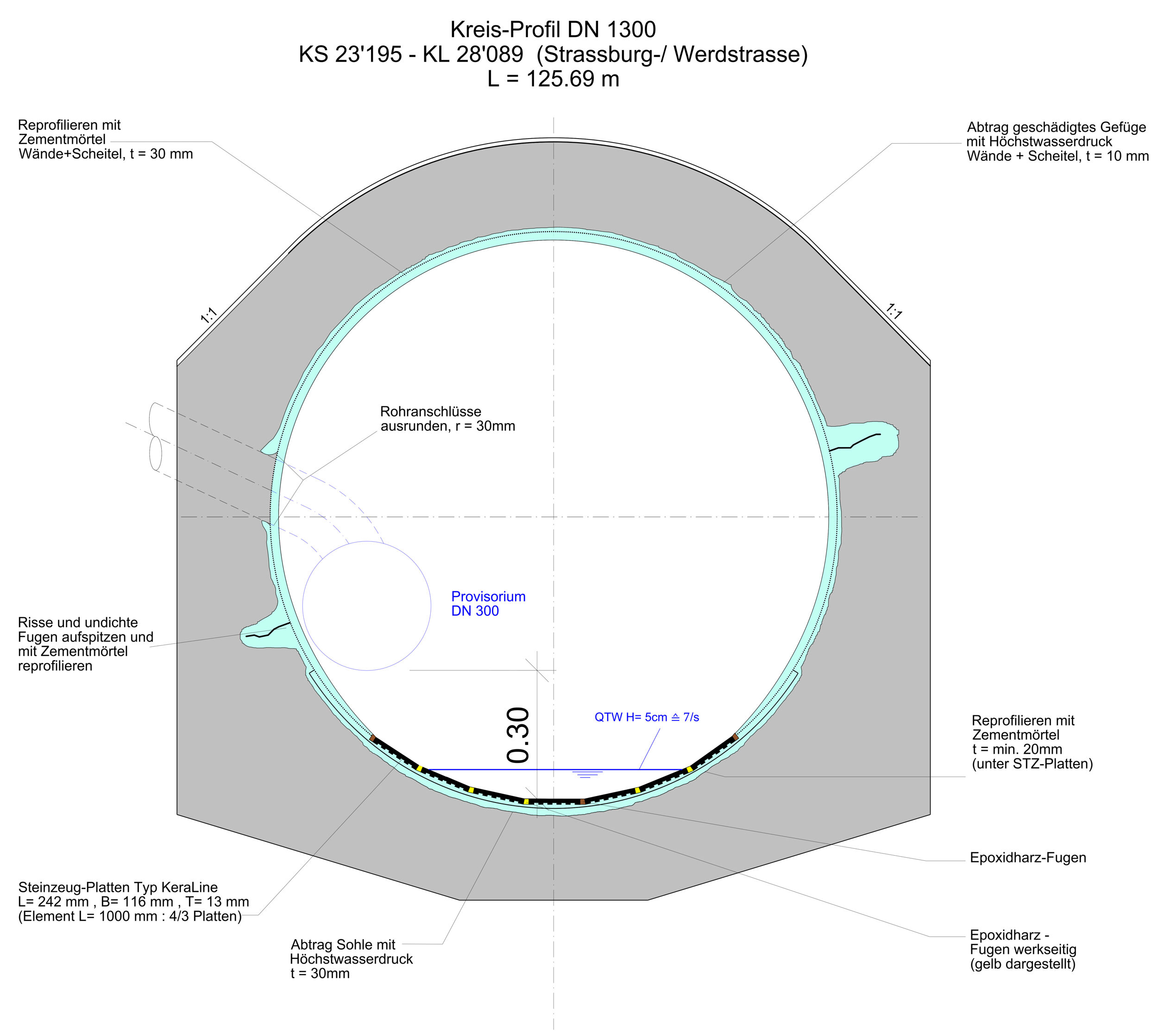 Die Sohle wurde mit einer ca. 20 mm starken Zementmörtelschicht reprofiliert und anschliessend im Bereich des Trockenwetterabflusses mit Steinzeug-Elementen Typ KeraLine ausgekleidet. Danach wurde der restliche Kanalquerschnitt mit einer 30 mm starken Zementmörtelschicht reprofiliert. Es resultierte eine Querschnittsreduktion von rund 5 %, welche aus hydraulischer Sicht und in Absprache mit ERZ toleriert werden kann.