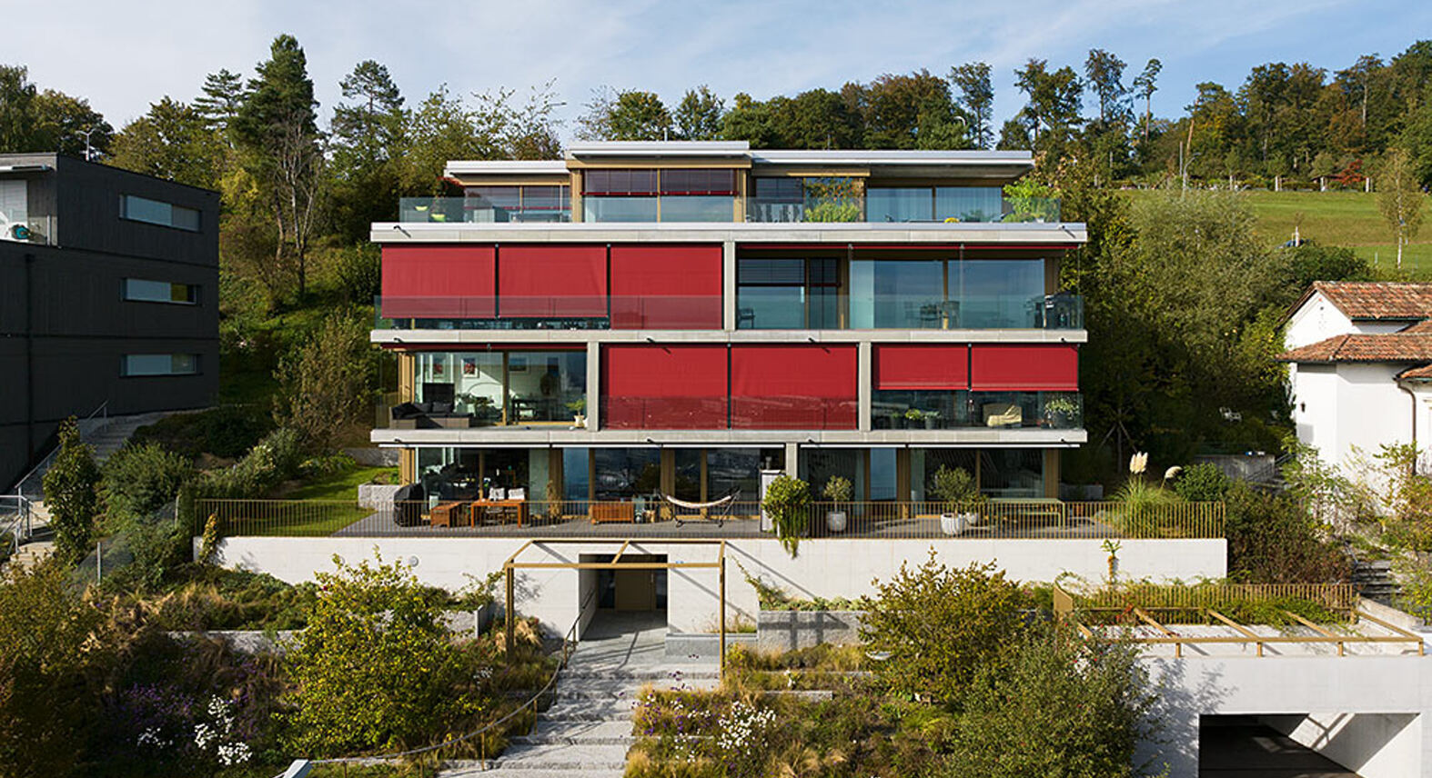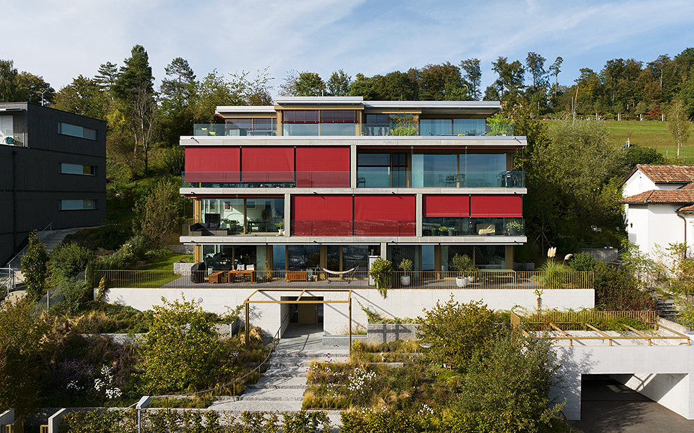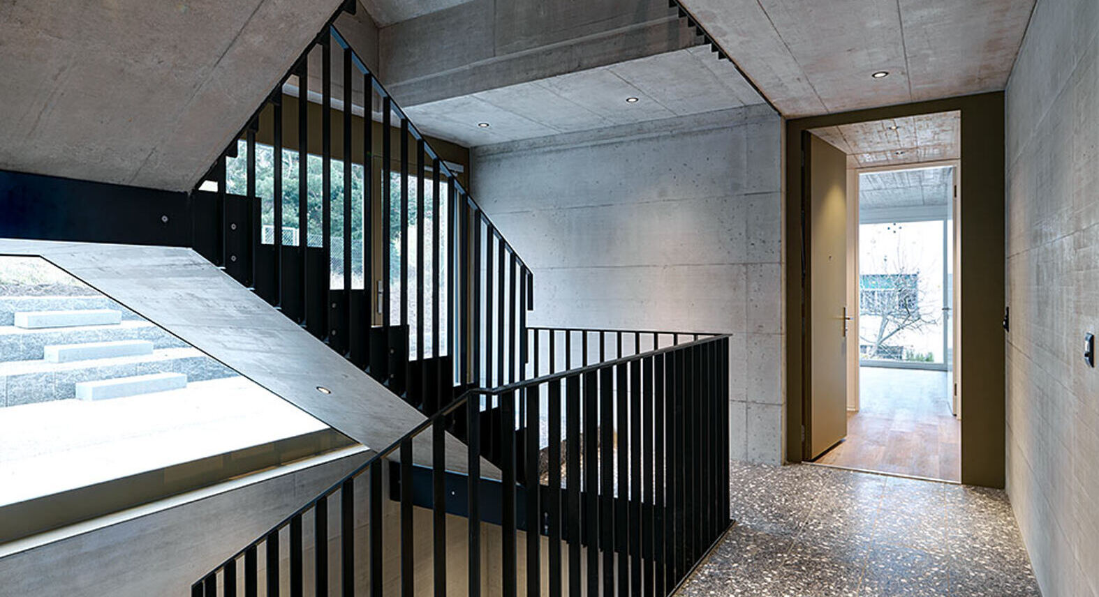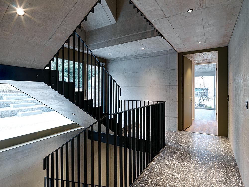 Mehrfamilienhaus mit Einstellhalle an Hanglage und Treppenhaus in Sichtbeton