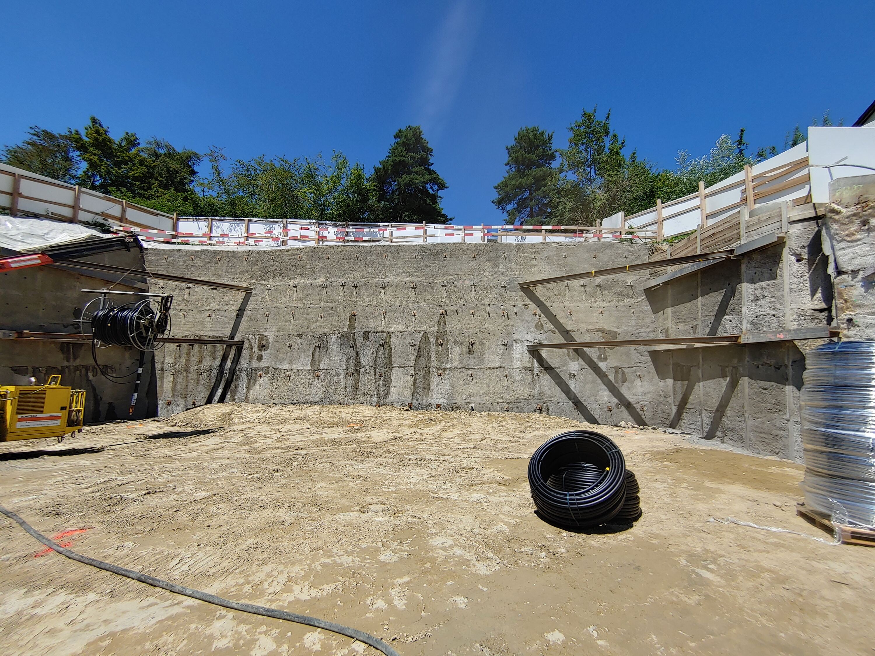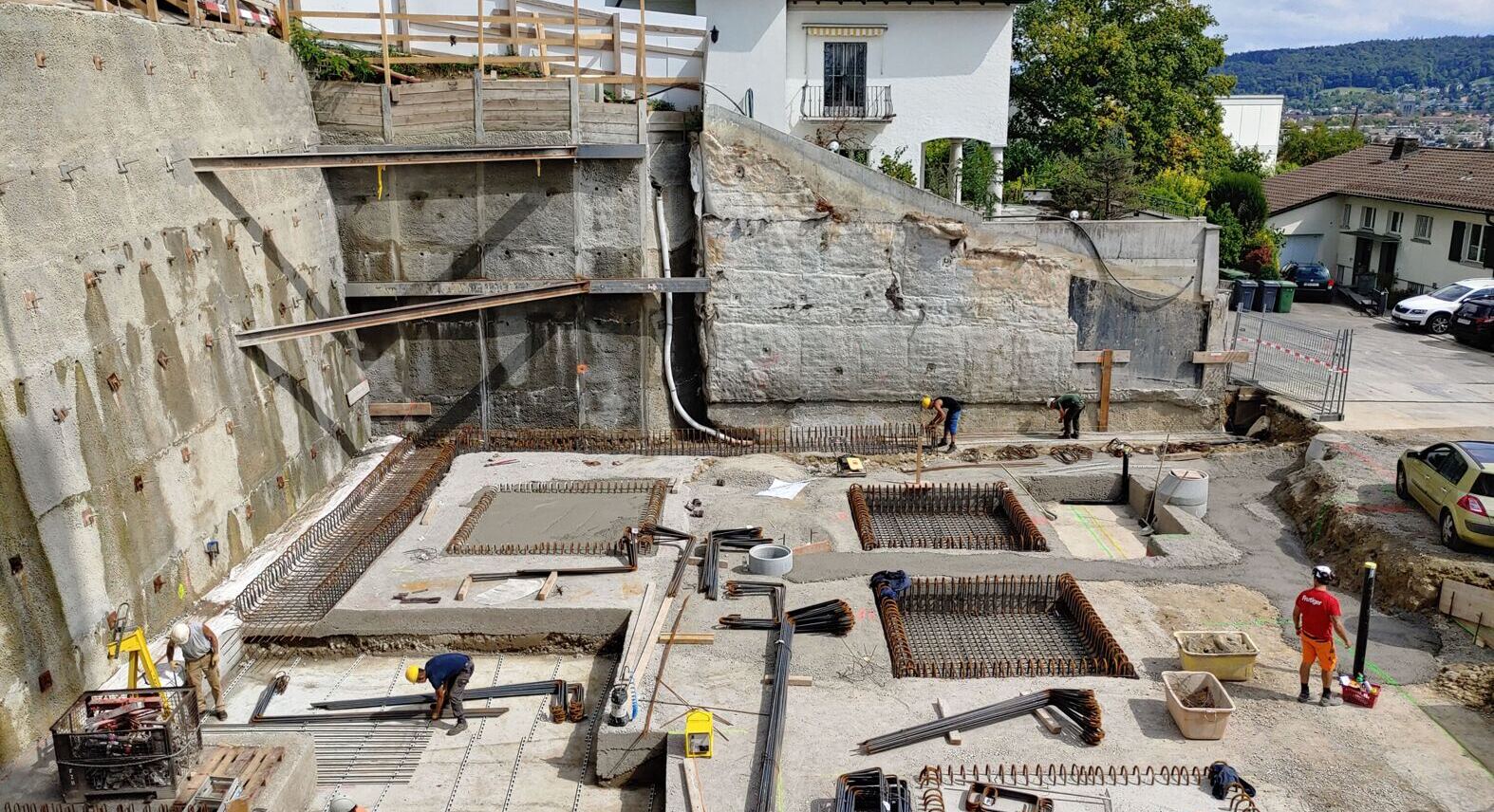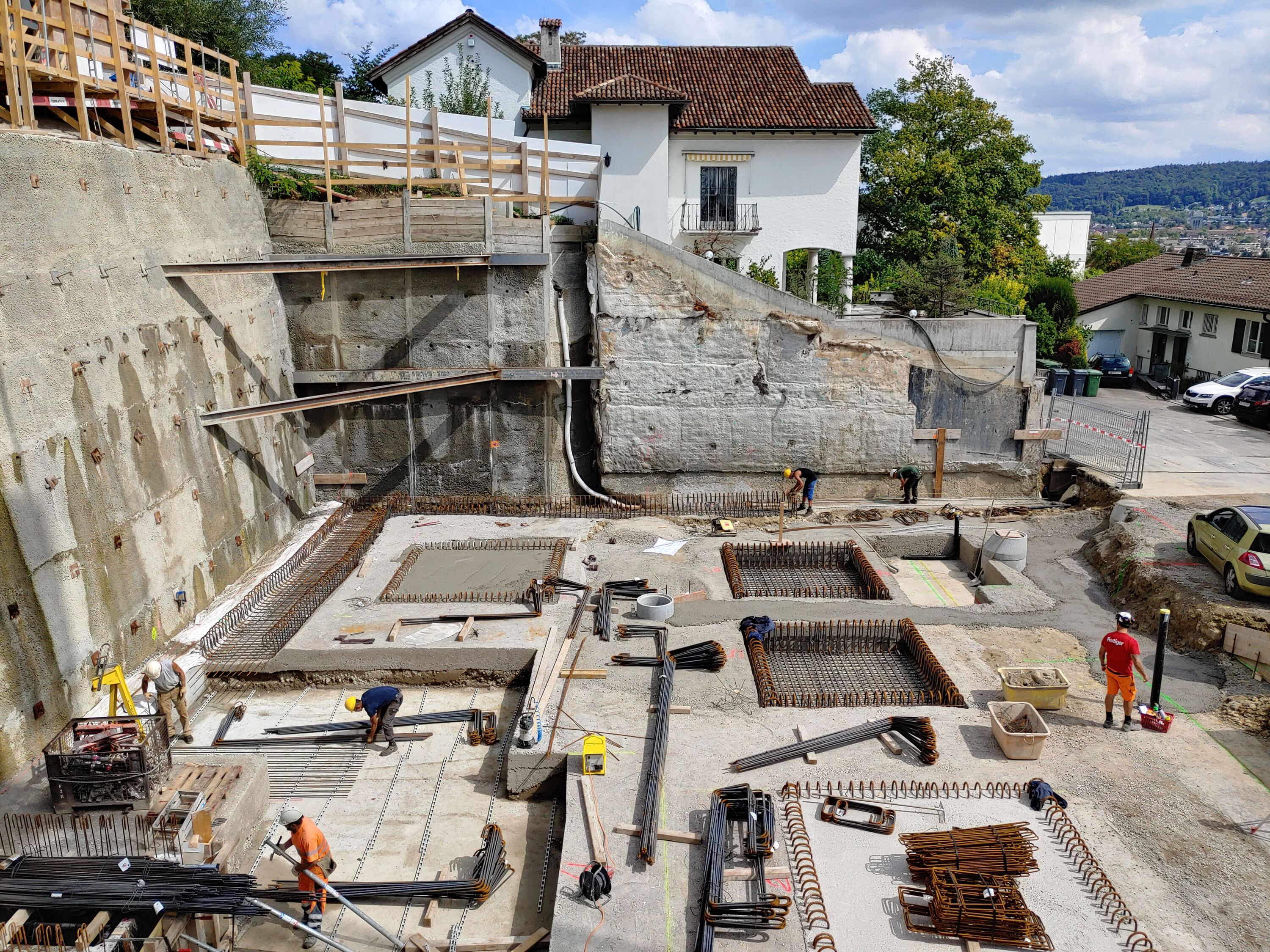 Die Baugrube wurde mit Hilfe von Nagel- und Rühlwänden gesichert, die dreiseitig um die Baugrube führten. Die maximale Höhe der Baugrube betrug in etwa 9 m. Bei dem Bau durften die Nägel nicht in die Nachbarparzellen ragen, weshalb die Baugrube durch Eckspriesse abgestützt werden musste. Die Spriesse führten dabei durch das später erstellte Gebäude und mussten nach der Hinterfüllung rückgebaut werden. Damit hi nter dem Gebäude kein Rückstau von Hangwasser entsteht, wurden unterhalb der Bodenplatte mehrere Rigolen eingebaut.