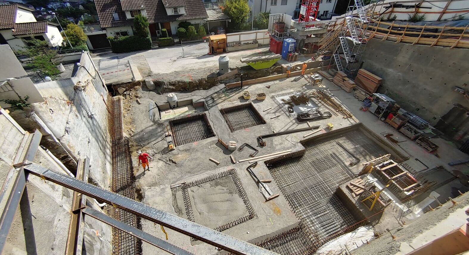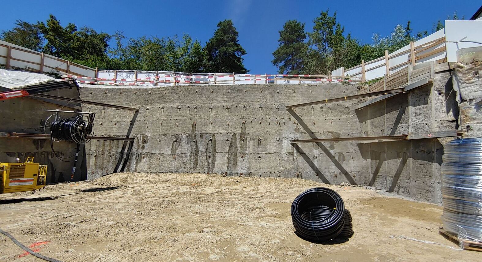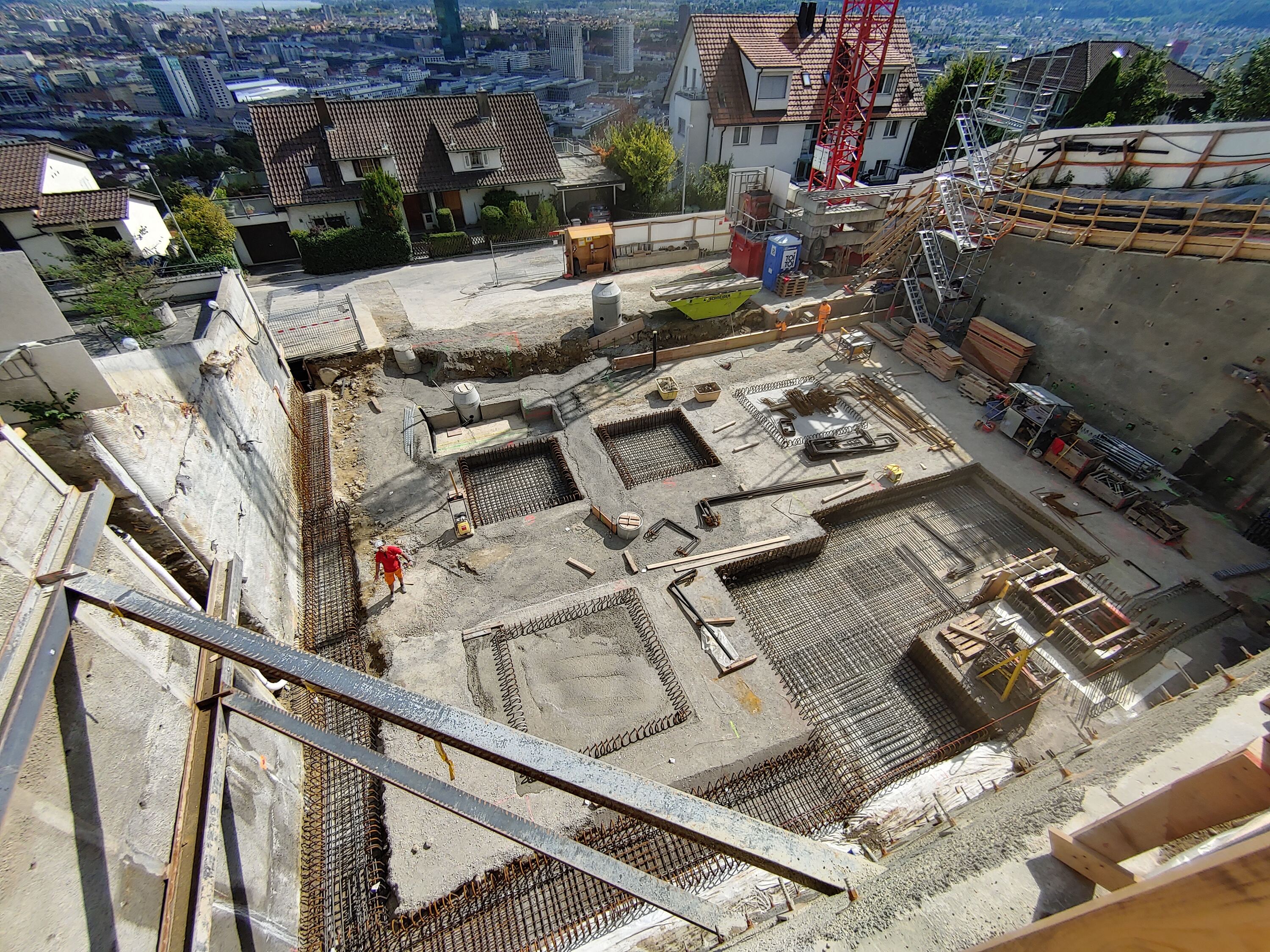 Die Baugrube wurde mit Hilfe von Nagel- und Rühlwänden gesichert, die dreiseitig um die Baugrube führten. Die maximale Höhe der Baugrube betrug in etwa 9 m. Bei dem Bau durften die Nägel nicht in die Nachbarparzellen ragen, weshalb die Baugrube durch Eckspriesse abgestützt werden musste. Die Spriesse führten dabei durch das später erstellte Gebäude und mussten nach der Hinterfüllung rückgebaut werden. Damit hi nter dem Gebäude kein Rückstau von Hangwasser entsteht, wurden unterhalb der Bodenplatte mehrere Rigolen eingebaut.