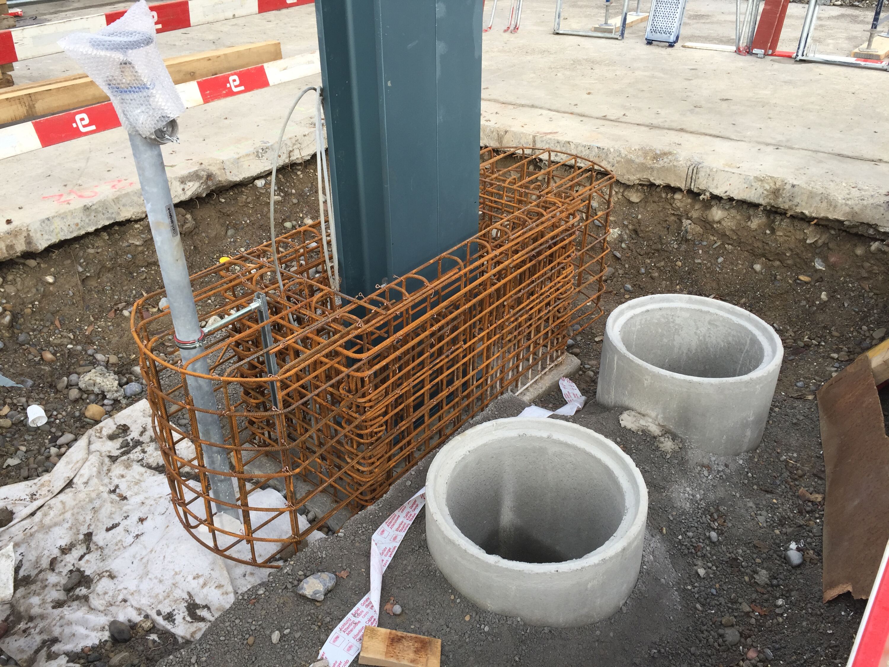 Die Stützen sind in Köcherfundamenten eingespannt, welche über Einzelfundamente bis in die tragfähigen Limmattalschotter in rund 3 m Tiefe fundiert werden. Dank der grossen Betonplatte können die Container ohne Probleme auf und abgeladen werden.
